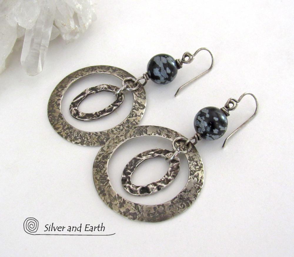These handcrafted sterling silver hoop earrings have a rustic, hammered texture and are accented with natural snowflake obsidian stones. This stone is a natural volcanic glass which contains the mineral cristobalite - which creates the "snowflake" type patterns in hues of black and soft gray.