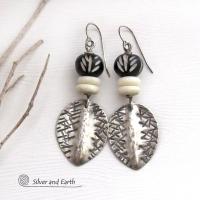 These handcrafted sterling silver earrings have a bold, ethnic tribal flair. They feature hand textured sterling dangles accented with African black bone beads with a carved white pattern and white bone beads. Unique and striking, they'll make a bold statement.