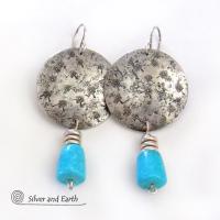 These sterling silver earrings feature Sleeping Beauty turquoise stones dangling from handcrafted sterling silver. Stylish and versatile, they have a subtle southwestern -- yet modern flair and will make a striking statement! The turquoise originates from the Sleeping Beauty mine in central Arizona, USA. This mine is known for producing high quality turquoise that is a stunning shade of sky blue – reminiscent of the lovely blue skies here in the American Southwest. The mine closed in 2012, so this turquoise is becoming increasingly hard to find, which adds to its value.