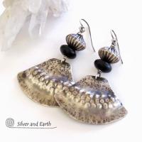 These handcrafted sterling silver earrings have a modern southwestern flair. The sterling shapes have a hammered and stamped texture and are accented with Native style oxidized sterling silver beads with a rich, corrugated texture and matte black glass beads.