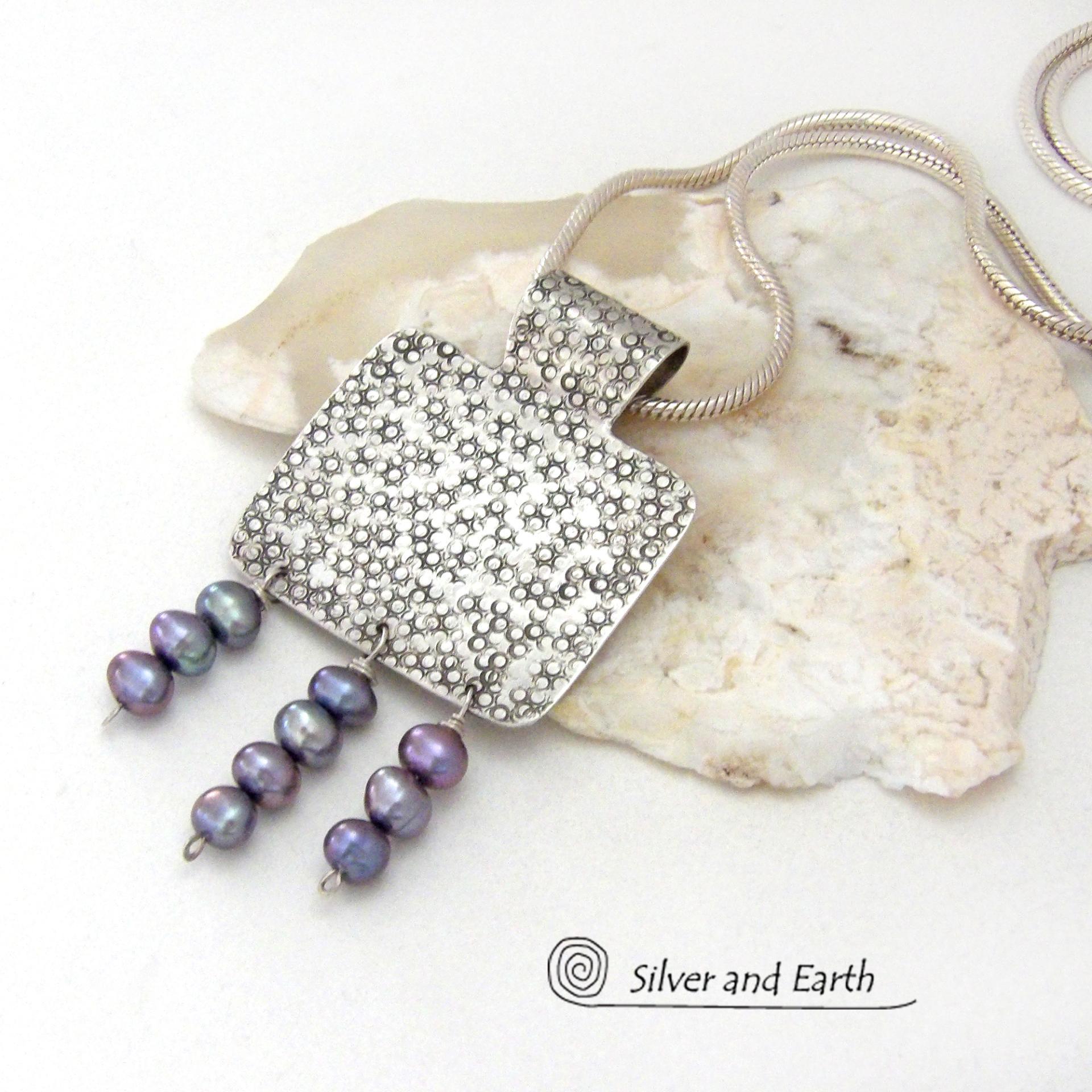 This handcrafted sterling silver necklace has a hand stamped texture and is accented with silvery blue freshwater pearl dangles. It has a modern, earthy - yet elegant dressy design that will complement many wardrobe styles. I hand sawed the pendant out of solid sterling silver sheet; created the texture; then oxidized it to enhance the details. The pearls were stacked on sterling silver wire and added to dangle from the bottom.