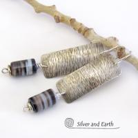 These handcrafted sterling silver earrings have a hammered texture and are accented with dangling black and white banded agate gemstones. This agate is a type of banded Chalcedony, a mineral of the quartz family. They have an earthy modern style and will look great with all wardrobe styles.
