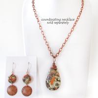 These earrings feature natural mushroom rhyolite jasper stones accented with handcrafted copper dangles with an organic, rustic texture. The stones have a natural earthy pattern with various shades of green, orange, brown and cream. This type of jasper gets its name from the unusual patterns that looks like a mass of growing mushrooms. They have a simple, earthy style and will make a great gift for a natural stone lover.