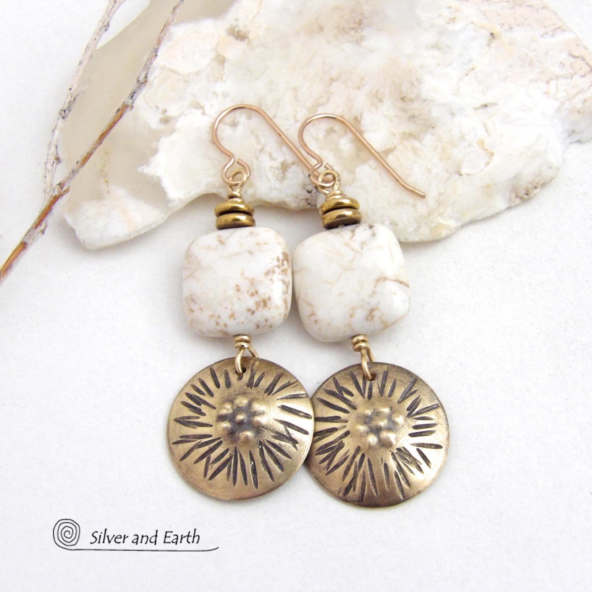 These gold brass dangle earrings have a unique hand textured design and are accented with creamy white magnesite stones. The stones have a natural matrix of golden-brown speckled inclusions and are topped off with tiny brass beads. I created the dangles out of solid gold brass sheet; and then created the texture which reminds me of the golden rays of the sun. The metal was oxidized to enhance the detail; then sealed with jeweler's wax to resist tarnishing.