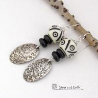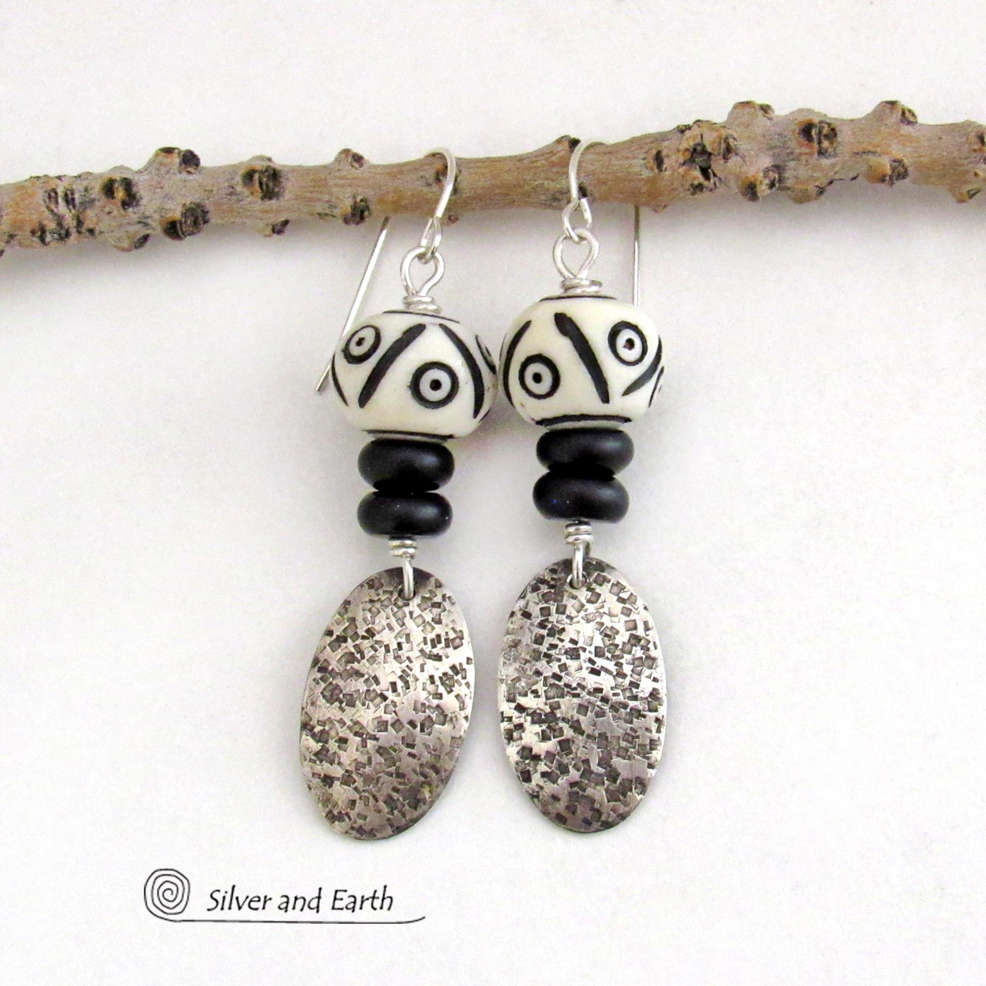 Textured Sterling Silver Dangle Earrings with Black and White African Carved Bone Beads