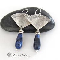 These handcrafted sterling silver earrings have a hand textured design and are accented with blue sodalite gemstones and tiny silver pewter beads. The stones have a rich, royal blue hue with subtle white inclusions.