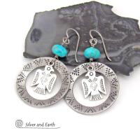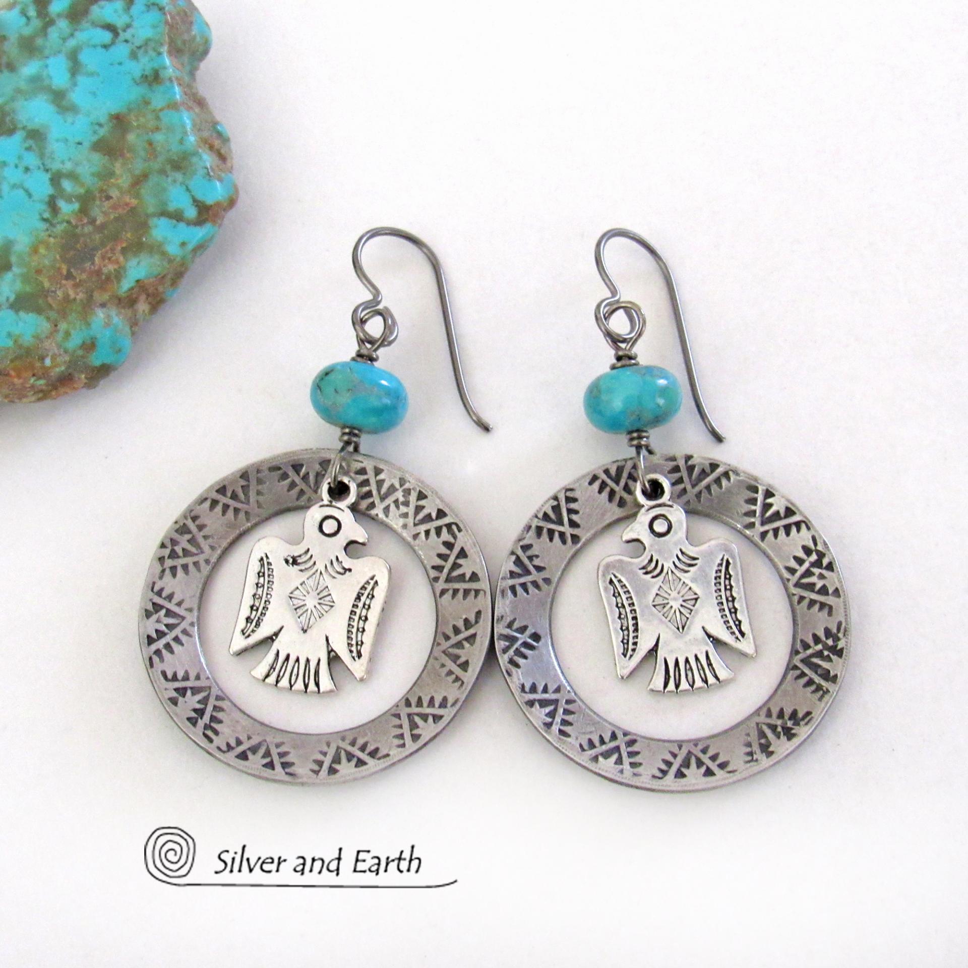 These handcrafted earrings feature silver tone pewter hoops with a hand stamped texture accented with thunderbird charms and blue turquoise stones. They have a modern earthy style with southwestern flair.