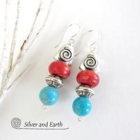 Turquoise & Coral Earrings with Spiral Pewter Beads - Southwestern Jewelry